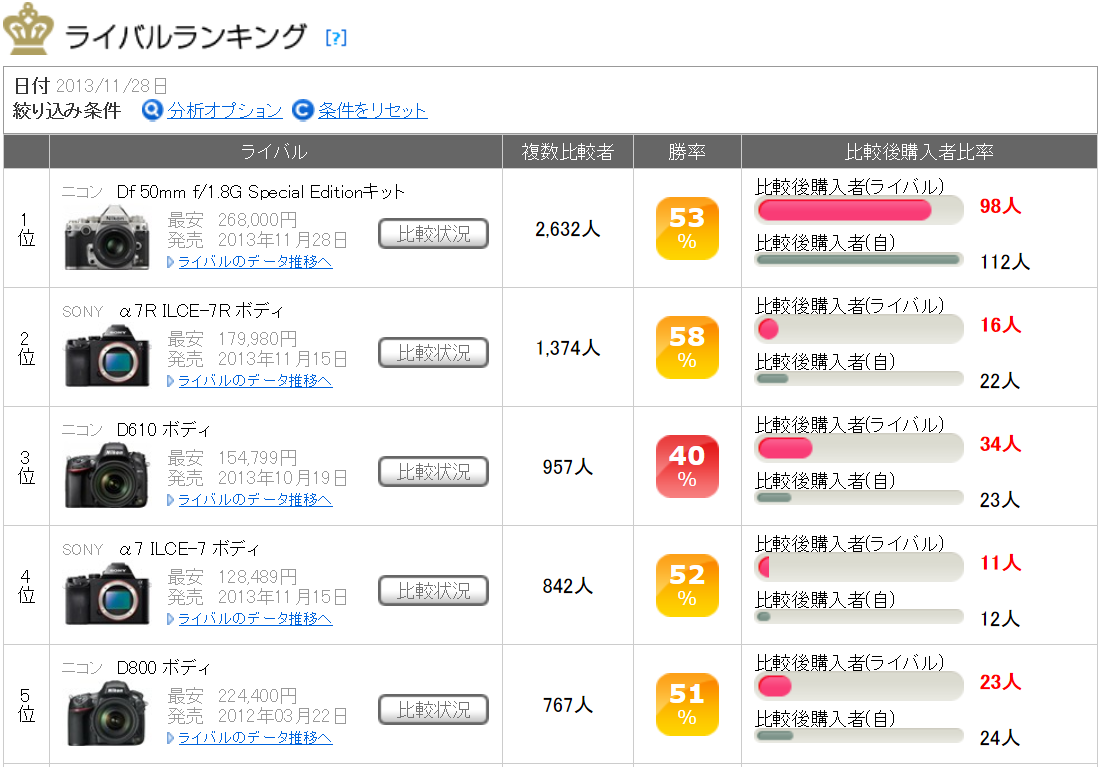 結果、本製品とどちらのほうがよく買われたを確率で示している。なお、今回のライバルランキングでは、発売日の11月28日の状況を分析した。これによる